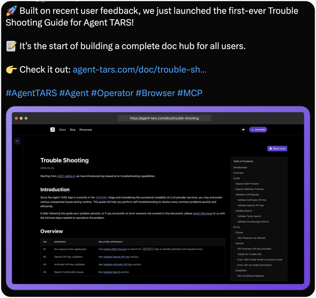 The release of Agent TARS Beta is just a beginning. In fact, we have only released the first default version of Agent TARS, while a version with dynamic planning reasoning is currently in internal testing. Agent TARS is still developing at a rapid pace. Although we have brought many new features in this release, there are still many aspects that need improvement, such as developer documentation and the presentation of deliverables. We will push for continuous subsequent releases as soon as possible, so please look forward to our updates.